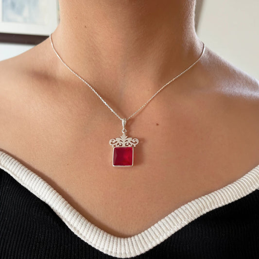 Minimalist Handmade Silver Pendant Necklace with Red Cubic Zirconia