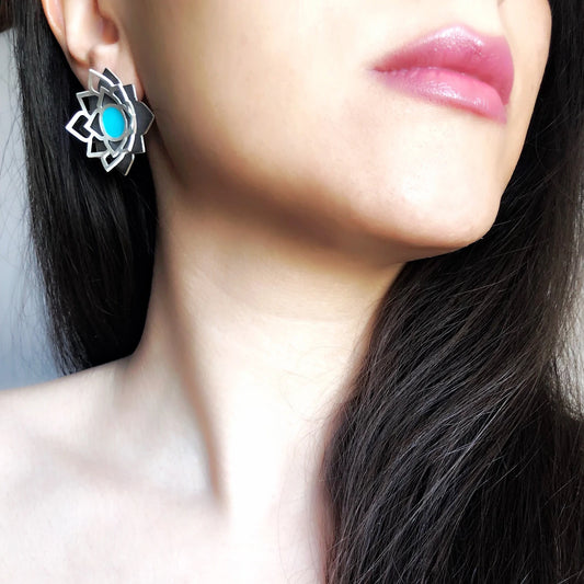 Square Handmade Oxidized Silver Stud Earrings with Turquoise