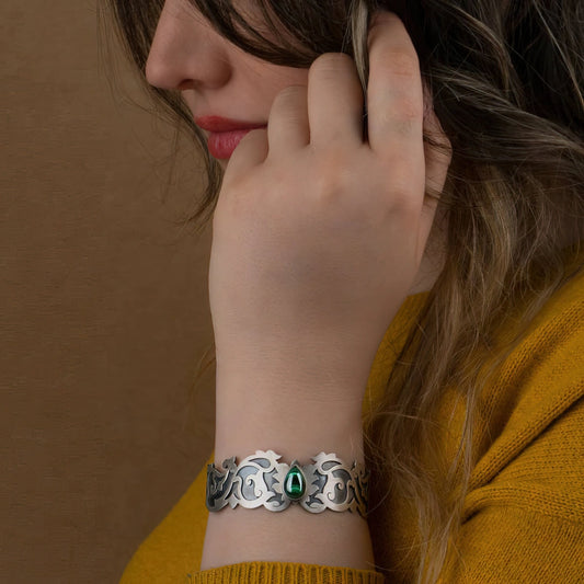 Handmade Silver Statement Bracelet with Intricate Details- Persian Rug Collection