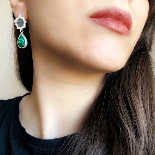 Handmade Silver Star Drop Earrings with Malachite and Pearl