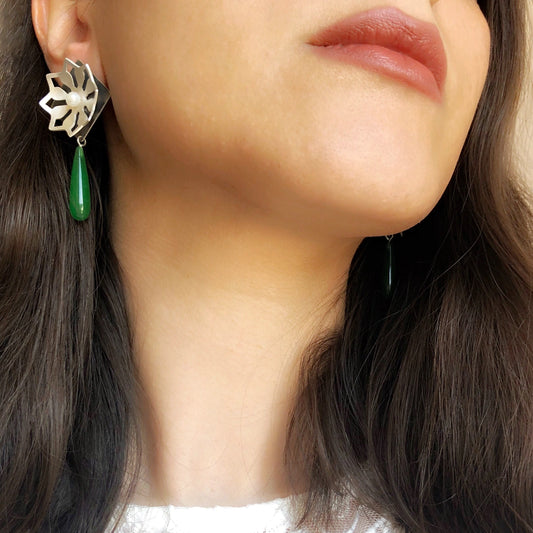 Handmade Silver Drop Earrings with Pearls and Green Agate