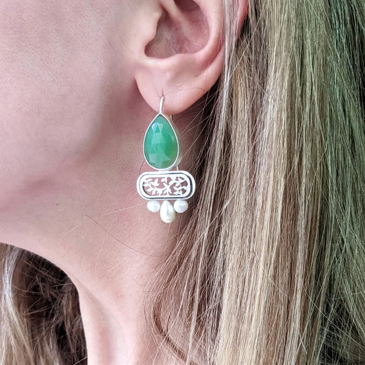 Faceted Green Onyx and Pearls Handmade Silver Earrings