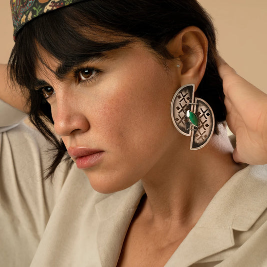 Handmade Silver Half-Circle Statement Earrings with Malachite