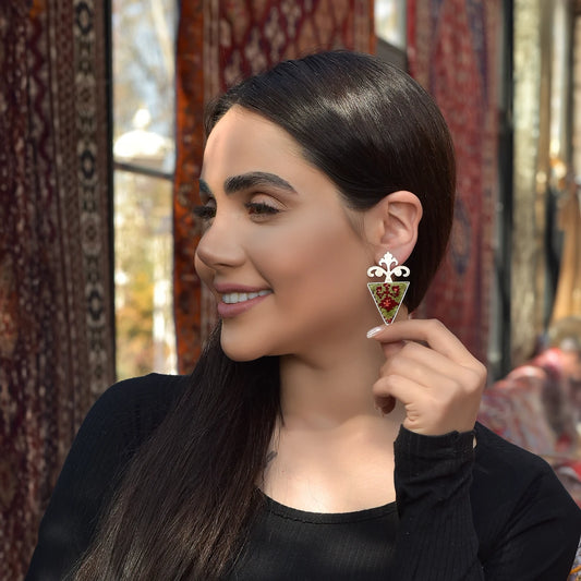 Handmade 3D Silver Statement Earrings with Persian Rug and Crystals