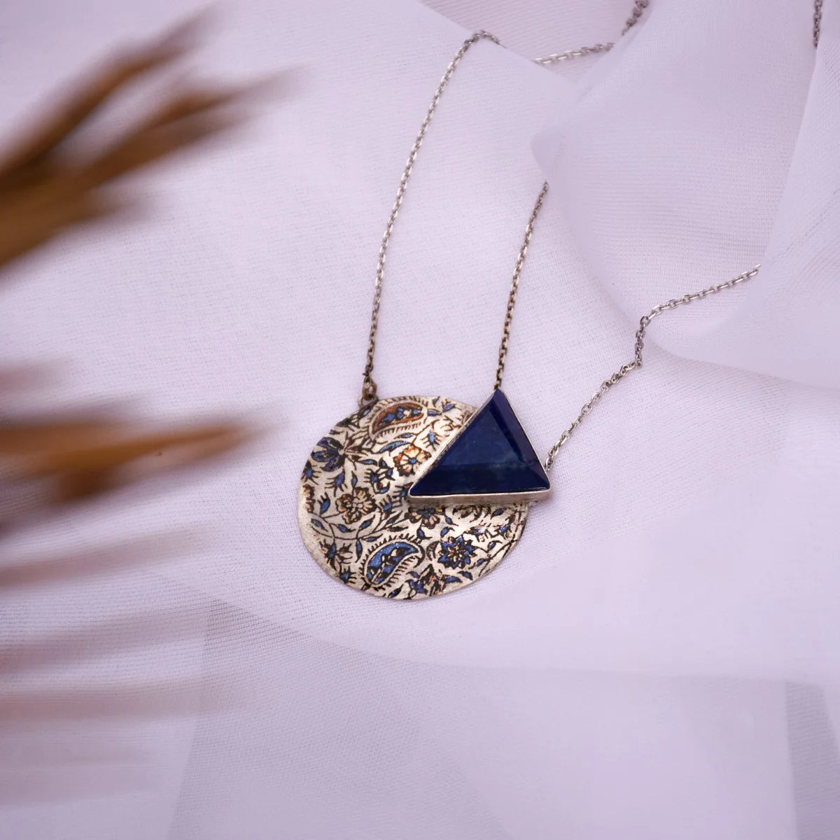 Unconventional and unique, our Handmade Silver Full Circle Necklace is a stunning statement piece. The opposition of the round circle pendant and triangular lapis lazuli adds a special touch, while the intricate floral patterns make it stand out. Handmade with silver, this pendant necklace is truly one of a kind.